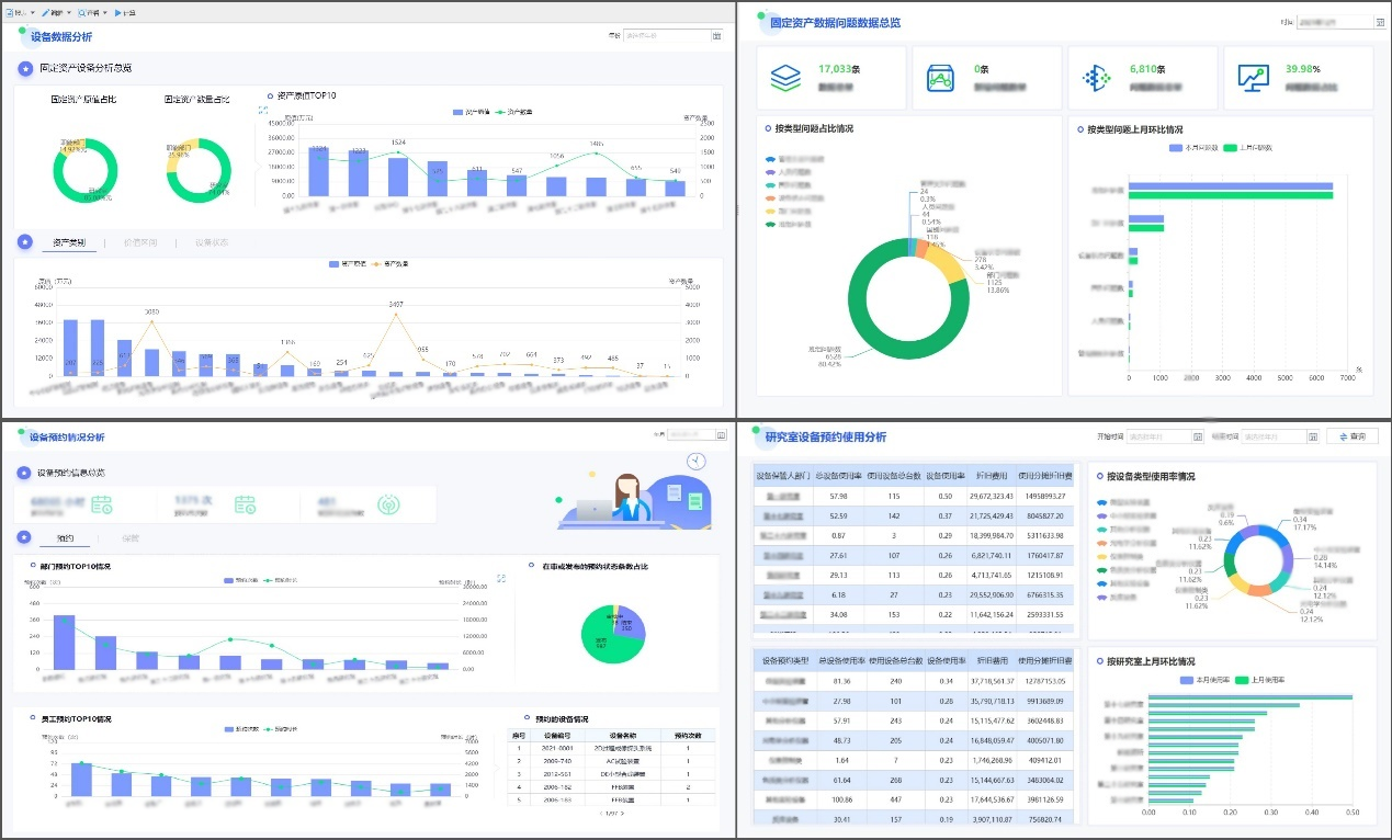 其次,围绕设备主数据相关内容,整合物资管理系统、设备共享应用等系统,完成约20张专题看板建设,初步完成了设备使用管理及预约共享业务的可视化,为企业管理者提供了全新的业务视角。