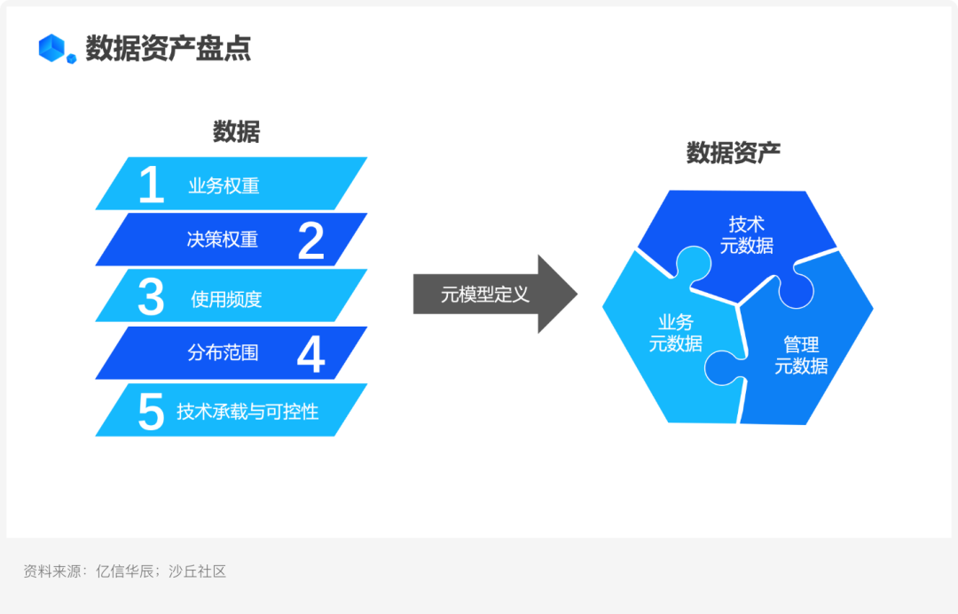 与普通数据不同,数据资产带有业务价值,能够体现在后续的业务应用中。因此,在数据资产盘点时,依据业务权重、决策权重、使用频度、分布范围、技术承载与可控性五个维度对资产进行综合判断: