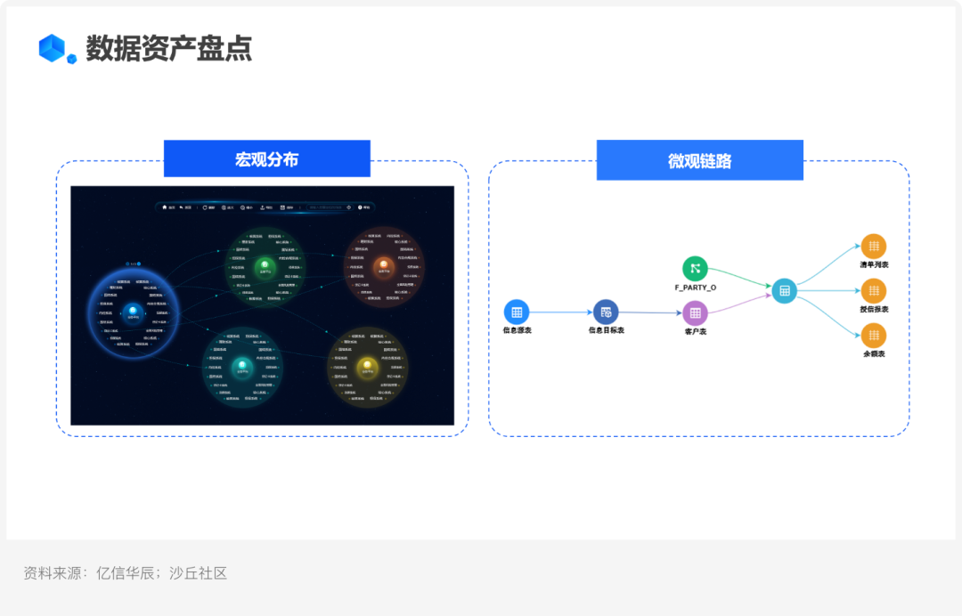 • 微观链路:数据资产的所有者需要了解资产的产生过程、管理者需要考虑如何将资产作用最大化,资产的消费者需要知道拿到的资产是否是其想要的数据,以上均需要微观链路进行反复核实。