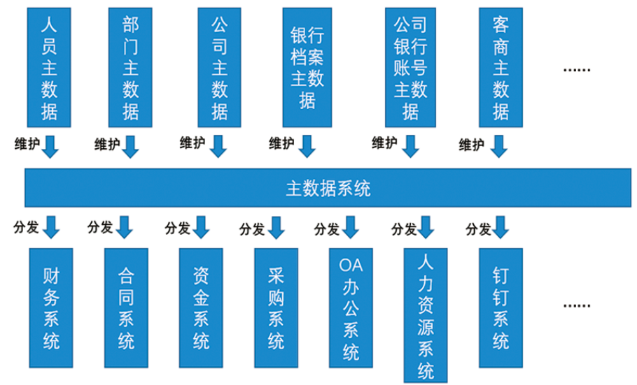 在企业主数据系统建设以前,业务系统之间需要数据互通时需要定制接口开发,数据大量转码,数据意义不统一。现在主数据系统的建设提供了统一的数据共享平台,各业务系统均可从主数据系统中以标准的接口获取到各类主数据的数据,且数据标准及含义都是统一的,业务系统在获取完主数据之后可直接通过主数据进行关联,有效地降低了数据共享的成本,瓦解了业务系统间的信息孤岛壁垒。