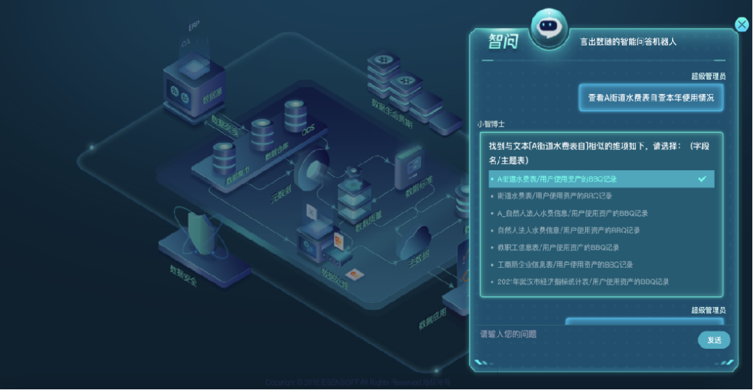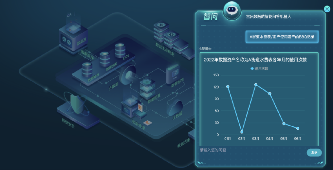 支持用户采用聊天对话的方式查询数据、分析数据,与智问机器人进行问答交互。问题一经提出,图表即刻呈现。