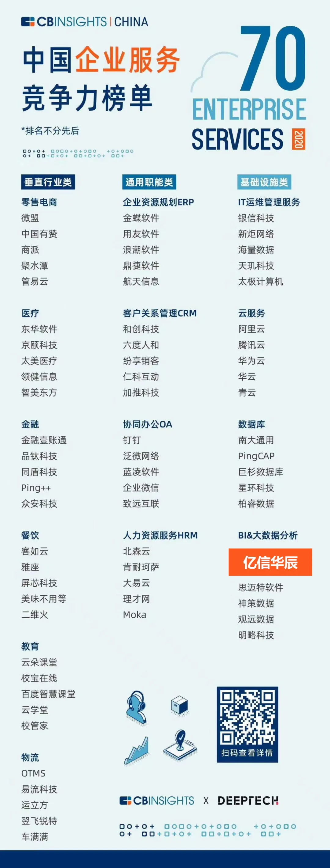 5月28日,全球知名的市场数据研究平台CB Insights首次发布了中国企业服务竞争力榜单。为了更好地理解企业服务的主要内容和行业状况,榜单按照服务层次和内容区分,将企业服务公司划分为不同类别,亿信华辰入选细分领域BI&大数据分析厂商榜单。