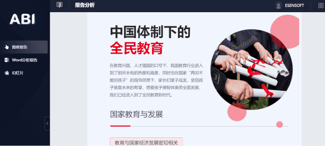 报告分析:Word和PPT是职场人士使用频率最高的汇报工具。考虑到这一使用场景,ABI支持Word式分析报告、即席报告和幻灯片满足用户不同的演示汇报需求。