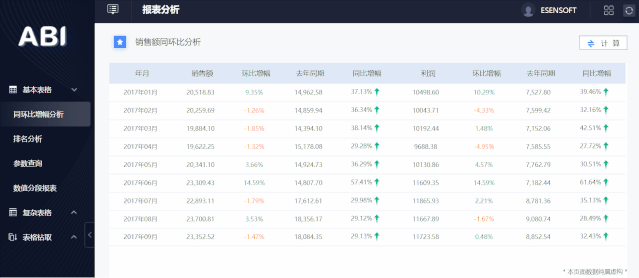 报表分析:包括同环比增幅分析、排名分析、参数查询等基本表格,还有中国式复杂报表、简历报表、聚合函数的等复杂表格,同时支持维度钻取、嵌入式等多种钻取方式。