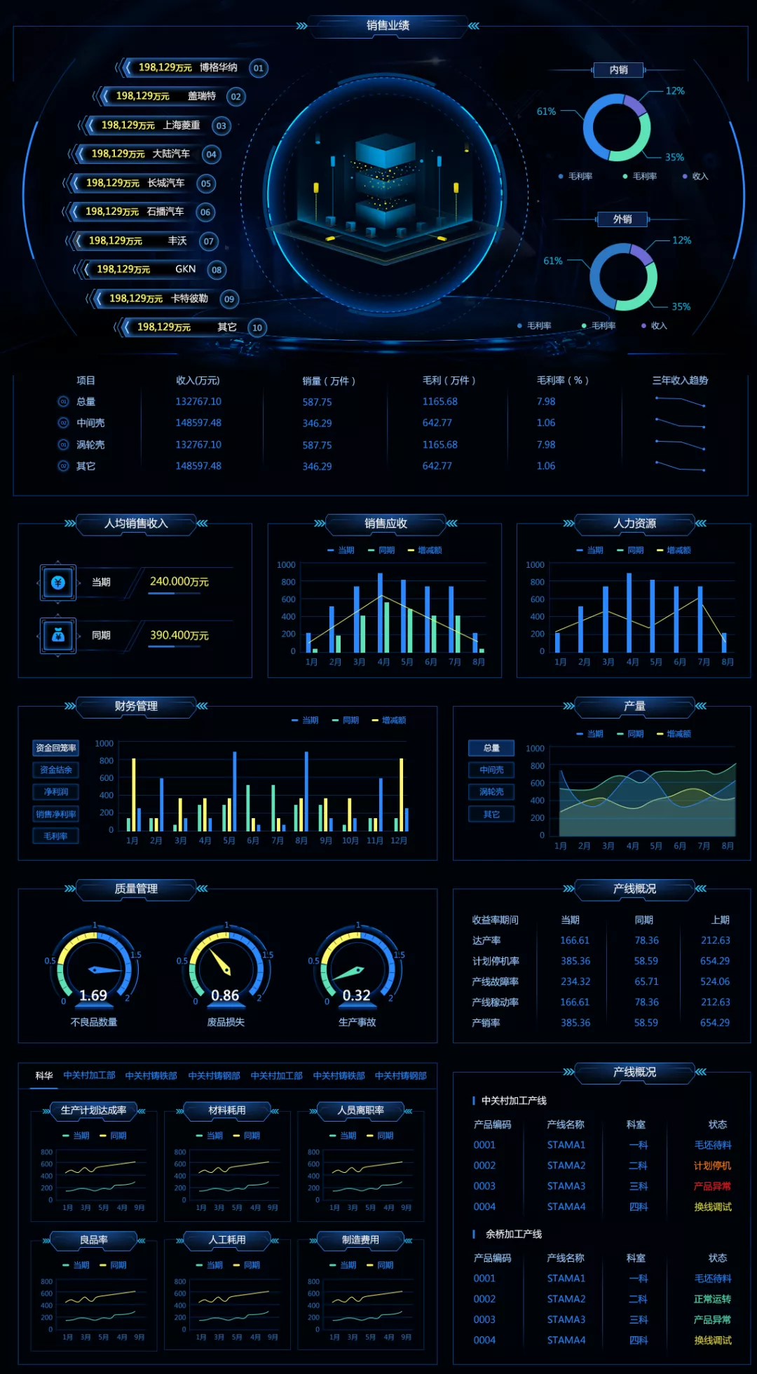 全面汇集生产数据资源形成面向主题的指标体系,包含综合分析、收入分析、在销产品、生产指标等分析,为决策者提供系统的数据分析,多维度展现分析结果。