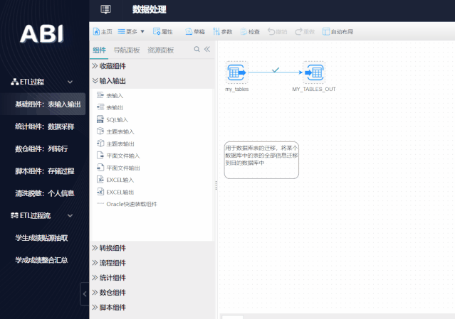 数据处理:列举了部分ETL过程及ETL过程流,亿信ABI通过运用大量可视化ETL组件,让传统的数据处理过程变得透明可见。