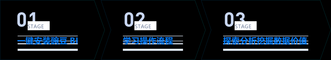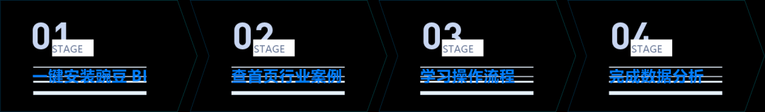 首先采用一键安装的方式,部署无忧,然后进入首页学习操作流程的帮助引导。由于豌豆BI本身具有上手快和易用的特性,每个流程均在6步以内便可完成,保证了用户在5分钟内便可学会数据分析。上手后就可直接实践啦,用豌豆BI不断探索价值,渐进明细数据分析。