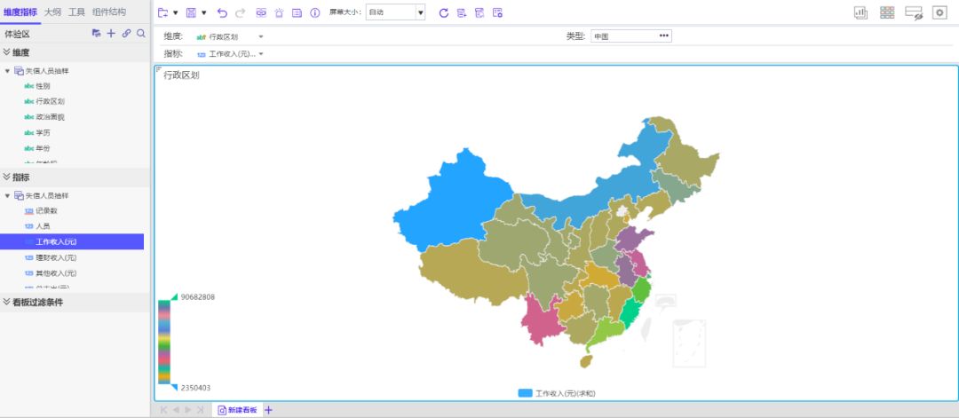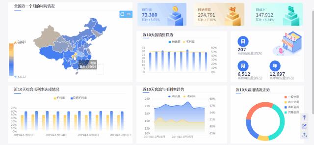 智能图表推荐:根据拖拽的指标和维度,识别最优的展现形式,来进行智能推荐。比如当用户使用“地区”这样指标时会自动使用地图进行数据展现。
