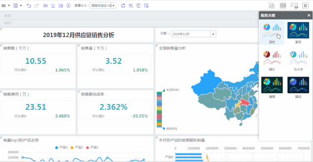 你不会设计、不懂配色,平时做ppt都靠到处搜罗模板?没关系,豌豆BI提供成套的配色方案,一键切换↓