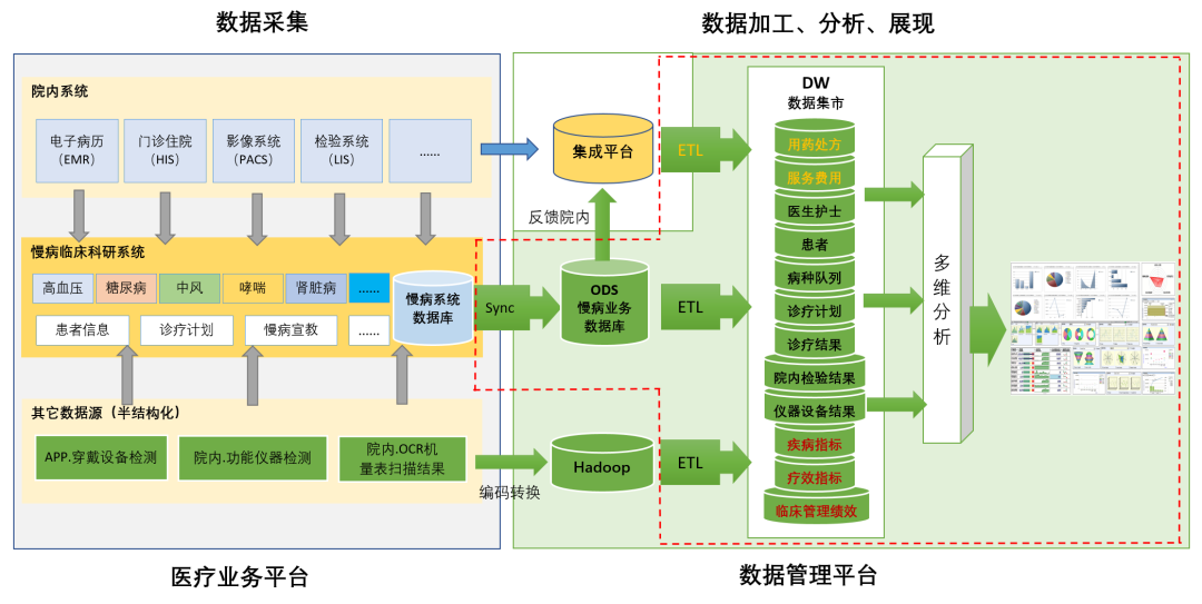 所需的病人就诊信息、慢病临床、科研、中医特色疗法服务、院内外功能仪器设备的检验检查等数据分散存在于不同厂家开发的院内外多个子系统中,虽然有长期的收集,但仍需做进一步汇聚和清理。