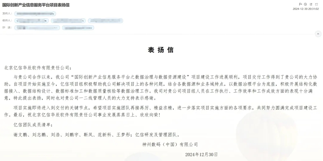我们还收到了来自合作伙伴神州数码、华科诚信的表扬信。在国际创新产业信息服务平台之数据治理与数据资源建设项目、中国重机一体化管控平台项目中,亿信华辰团队以专业的服务和精湛的技术,赢得了合作伙伴的广泛赞誉。这些合作不仅加深了我们与伙伴之间的友谊,更为双方未来的共赢发展奠定了坚实基础。