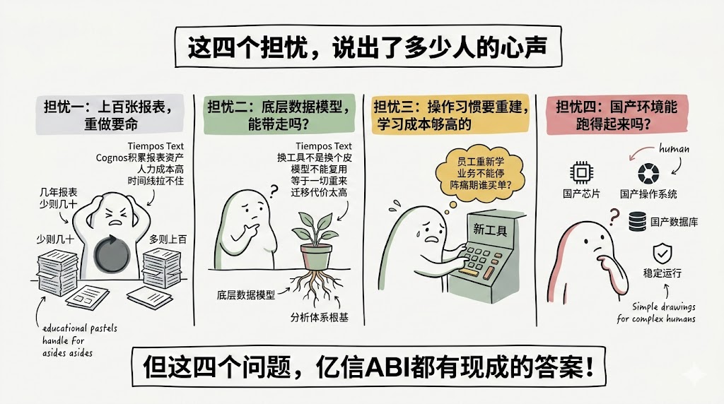 Cognos用户最常见的抱怨——跑一张大报表要等好几分钟、数据没法实时看、可视化效果说不上难看但就是不够现代、想做点定制二次开发难度极高——这些在亿信ABI里都有系统性的解决。