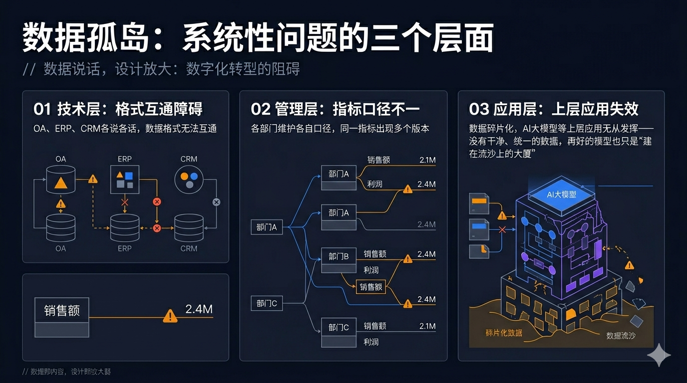 应用层:数据碎片化,AI大模型等上层应用无从发挥——没有干净、统一的数据,再好的模型也只是“建在流沙上的大厦”