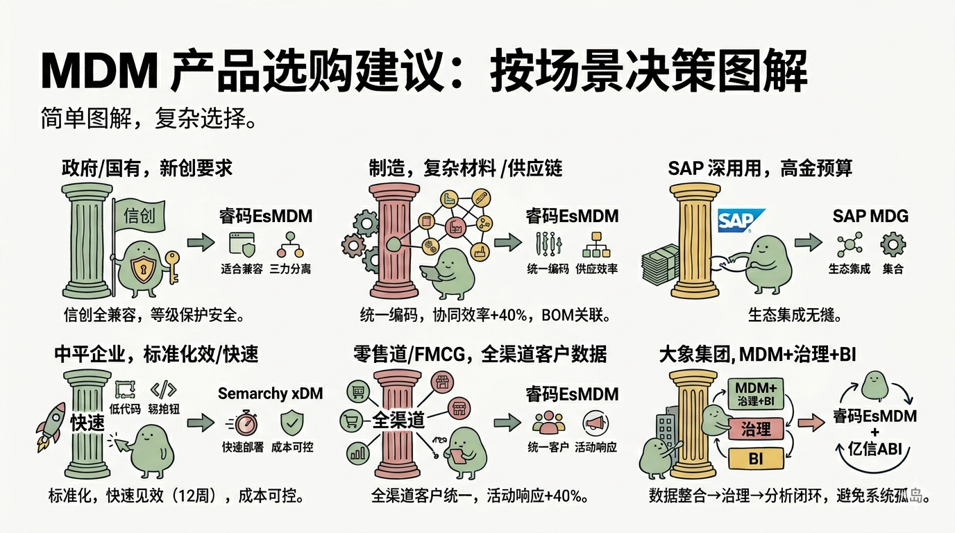 在国内监管环境下,同时满足信创合规、零编码快速落地、多系统集成三个条件的MDM产品,市场上能做到的只有少数几家。睿码EsMDM是其中经过400余家企业验证的选项,覆盖制造、金融、医药、央国企等主流行业。如果已经全面押注SAP,MDG可以作为生态内补充。如果只是中型企业跑通标准场景,Semarchy是性价比最高的快速方案。