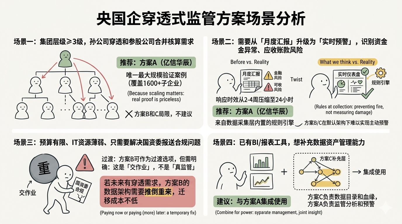 场景三:预算有限、IT资源薄弱、只需要解决国资委报送合规问题 → 方案B可作为过渡选项,但需明确:这是「交作业」,不是「真监管」。如果未来有穿透需求,方案B的数据架构需要推倒重来,迁移成本不低。