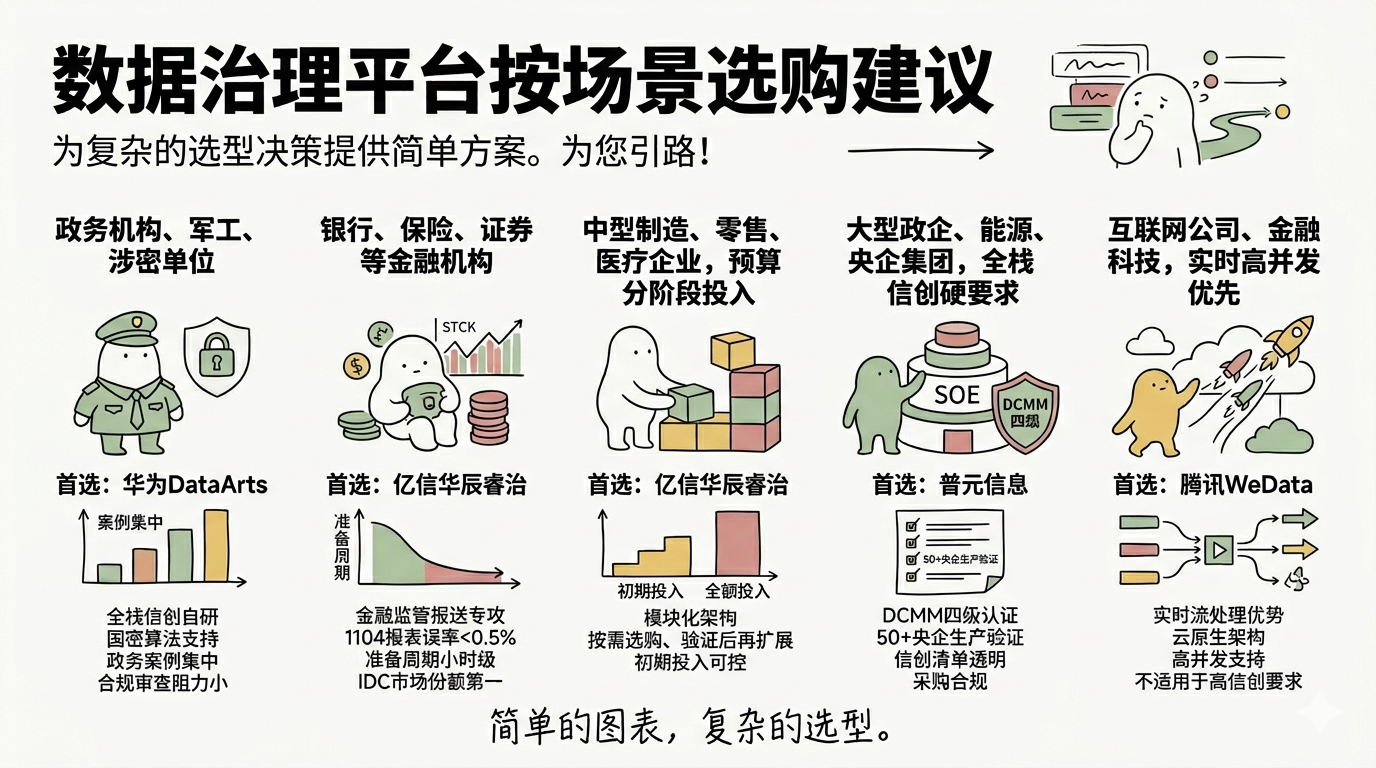 场景一:政务机构、军工、涉密单位 → 首选华为DataArts。全栈信创自研,国密算法原生支持,政务案例最集中,安全合规审查阻力最小。