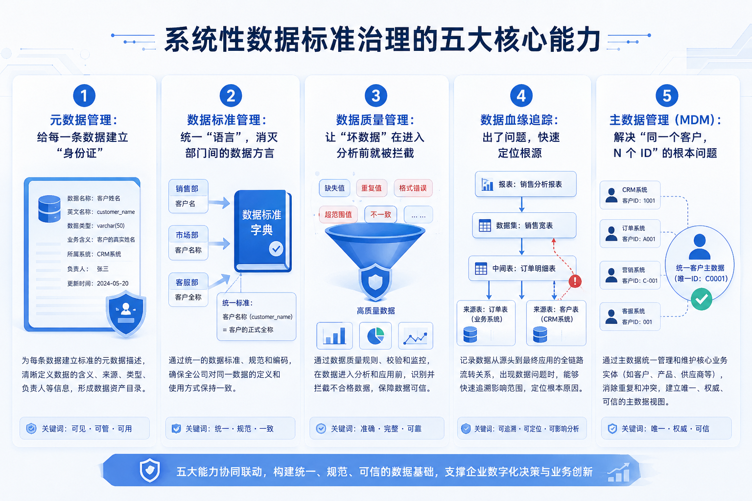 有了统一的标准,AI 才有高质量的燃料,管理层才有可信的决策依据,业务部门才能协同而非内耗。以下五个能力维度,是评估一套治理体系是否有效的核心标尺。