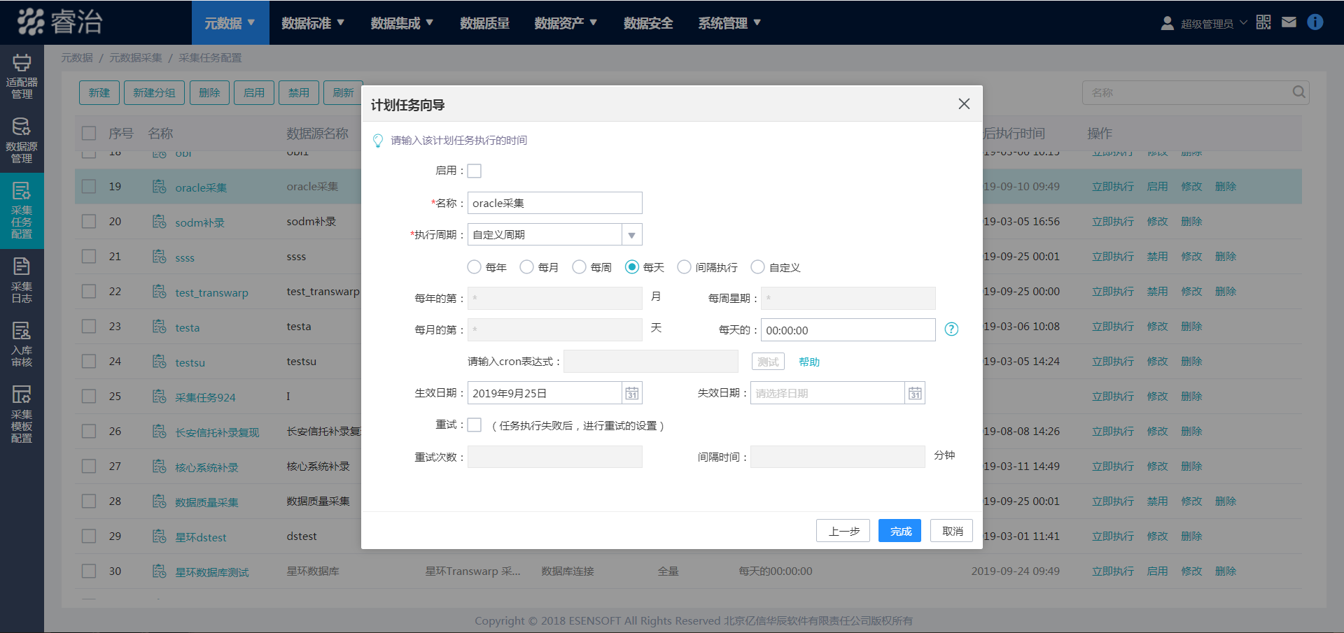 亿信华辰元数据管理平台拥有灵活的计划任务调度功能,通过配置可以让系统定时的完成元数据的获取等计划工程。计划任务支持多种时间粒度的调度,按周、月、天、小时、分钟等。